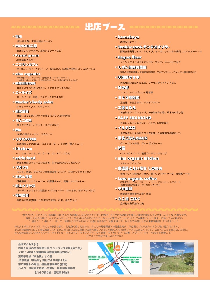 こだわりのオーガニック食材を使ったご飯ものやお菓子、こだわり農法で作られたお野菜や自然食材・加工品、ハンドメイド雑貨など、素敵なヒト・モノ・コトが集います。